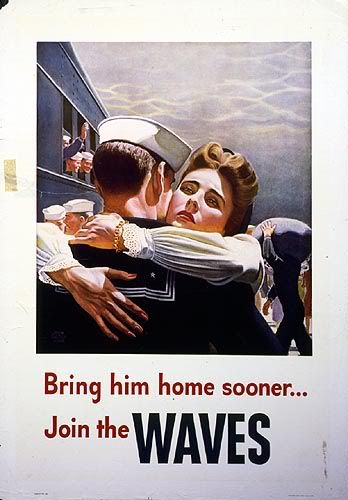 I like what you were saying about what the message of the poster was for you, but when I saw it I thought of the woman I met who had served in the WAC during WWII. WAC stands for Women's Army Corps. When I saw WAVES on the poster, I googled the term. WAVES stands for Women Accepted for Volunteer Emergency Services. Maybe your poster is telling women to join the Naval Reserve so that women's service can help to end the war sooner-- which would also bring their partners home sooner.