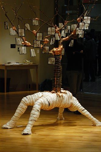 So I recently came across this picture in an internet add for an art school, and I was so intrigued that I wanted to share it with everyone. I'm not sure what message it is trying to send, exactly, but my first thought was "The Tree of Life." As most of you may know, the biblical tree of life represented eternal life. Anyone who drank its sap was able to life forever. I recently saw a movie called The Fountain, in which a man was in search for this tree. He feared death, but once he found the tree hidden deep in Eden, his idea of eternal life was not what he imagined. He drank the sap and from him sprouted plants and nature. He was granted eternal life, but he was now living as a part of Earth and nature for eternity. I wonder if the artist of this sculpture was trying to represent a similar concept: We are all linked in a circle of life. Maybe the artist was going for a more simple concept, such as a family tree. Either way, it is a very captivating creation.